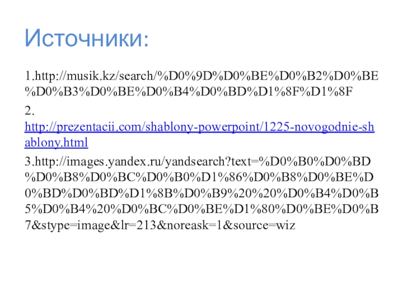 Источники:1.http://musik.kz/search/%D0%9D%D0%BE%D0%B2%D0%BE%D0%B3%D0%BE%D0%B4%D0%BD%D1%8F%D1%8F2. http://prezentacii.com/shablony-powerpoint/1225-novogodnie-shablony.html3.http://images.yandex.ru/yandsearch?text=%D0%B0%D0%BD%D0%B8%D0%BC%D0%B0%D1%86%D0%B8%D0%BE%D0%BD%D0%BD%D1%8B%D0%B9%20%20%D0%B4%D0%B5%D0%B4%20%D0%BC%D0%BE%D1%80%D0%BE%D0%B7&stype=image&lr=213&noreask=1&source=wiz