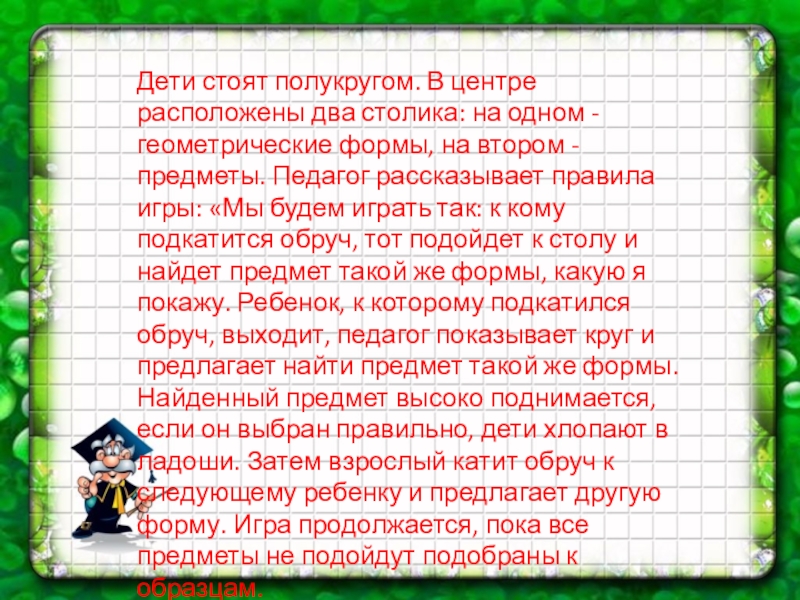 геометрические формы, на втором - предметы. Педагог рассказывает правила игры: «Мы будем играть так: к кому подкатится обруч, тот подойдет к столу и найдет предмет такой же формы, какую я покажу. Ребенок, к которому подкатился обруч, выходит, педагог показывает круг и предлагает найти предмет такой же формы. Найденный предмет высоко поднимается, если он выбран правильно, дети хлопают в ладоши. Затем взрослый катит обруч к следующему ребенку и предлагает другую форму. Игра продолжается, пока все предметы не подойдут подобраны к образцам.