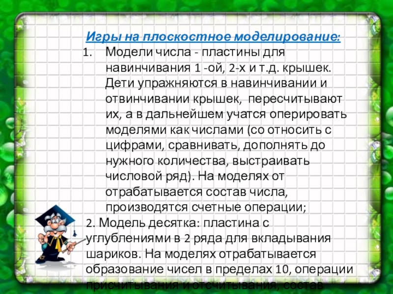 2. Модель десятка: пластина с углублениями в 2 ряда для вкладывания шариков. На моделях отрабатывается образование чисел в пределах 10, операции присчитывания и отсчитывания, состав числа.