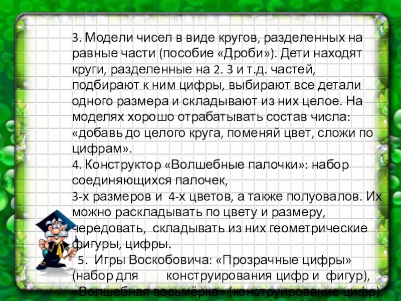«Дроби»). Дети находят круги, разделенные на 2. 3 и т.д. частей, подбирают к ним цифры, выбирают все детали одного размера и складывают из них целое. На моделях хорошо отрабатывать состав числа: «добавь до целого круга, поменяй цвет, сложи по цифрам».