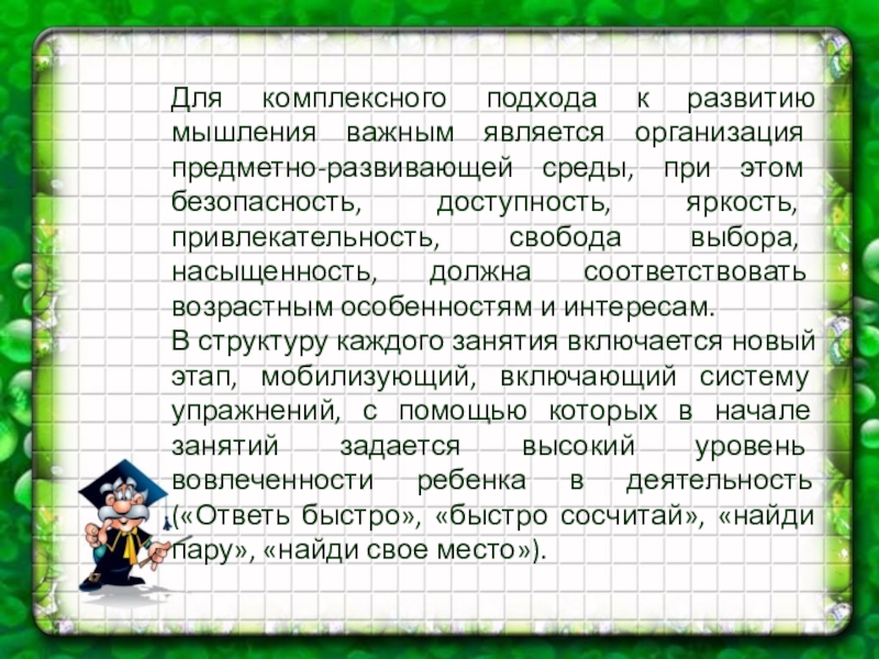 Для комплексного подхода к развитию мышления важным является организация предметно-развивающей среды,
