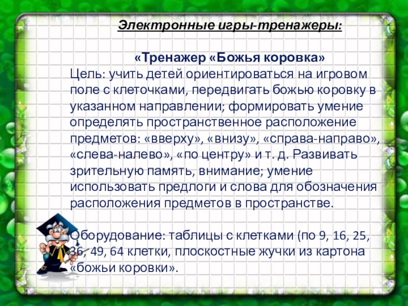 клеточками, передвигать божью коровку в указанном направлении; формировать умение определять пространственное расположение предметов: «вверху», «внизу», «справа-направо», «слева-налево», «по центру» и т. д. Развивать зрительную память, внимание; умение использовать предлоги и слова для обозначения расположения предметов в пространстве.