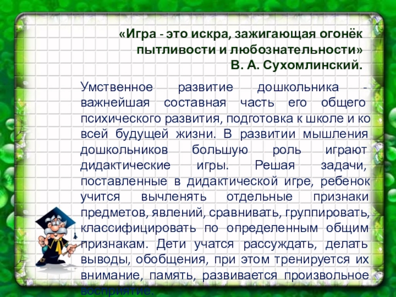 Умственное развитие дошкольника - важнейшая составная часть его общего психического развития, подготовка к школе и ко всей будущей жизни. В развитии мышления дошкольников большую роль играют дидактические игры. Решая задачи, поставленные в дидактической игре, ребенок учится вычленять отдельные признаки предметов, явлений, сравнивать, группировать, классифицировать по определенным общим признакам. Дети учатся рассуждать, делать выводы, обобщения, при этом тренируется их внимание, память, развивается произвольное восприятие.