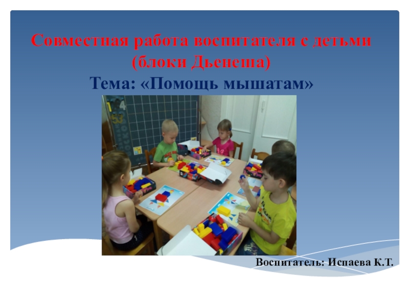 Слайд 1 Совместная работа воспитателя с детьми (блоки Дьенеша) Тема: «Помощь мышатам»