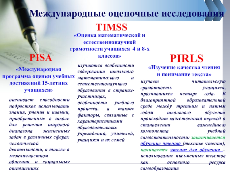 изучаются особенности содержания школьного математического и естественнонаучного образования в странах- участницах, особенности учебного процесса, а также факторы, связанные с характеристиками образовательных учреждений, учителей, учащихся и их семей