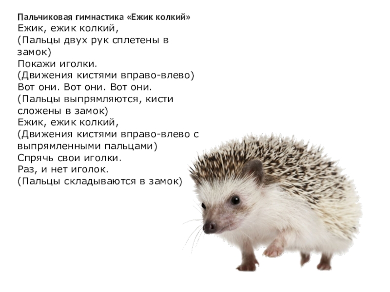 Пальчиковая гимнастика «Ежик колкий»Ежик, ежик колкий, (Пальцы двух рук сплетены в замок)Покажи иголки. (Движения кистями вправо-влево)Вот они.