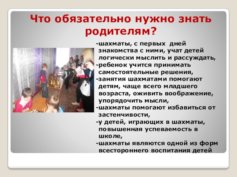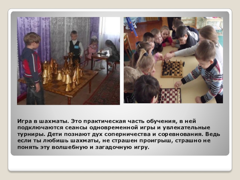 одновременной игры и увлекательные турниры. Дети познают дух соперничества и соревнования. Ведь если ты любишь шахматы, не страшен проигрыш, страшно не понять эту волшебную и загадочную игру.