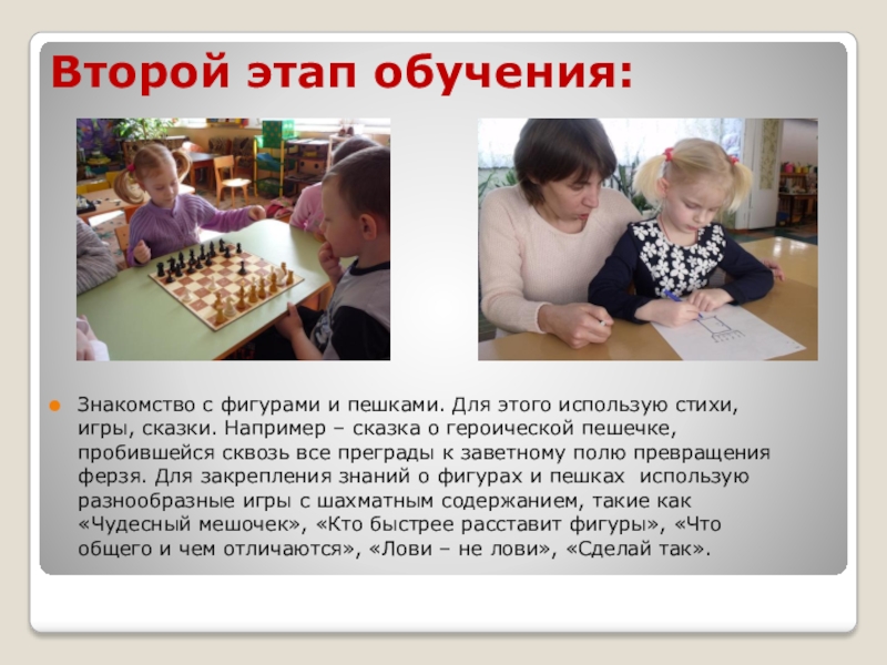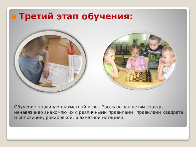 Слайд 6Обучение правилам шахматной игры. Рассказывая детям сказку, ненавязчиво знакомлю их с