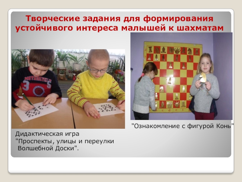 Слайд 5Творческие задания для формирования устойчивого интереса малышей к шахматам