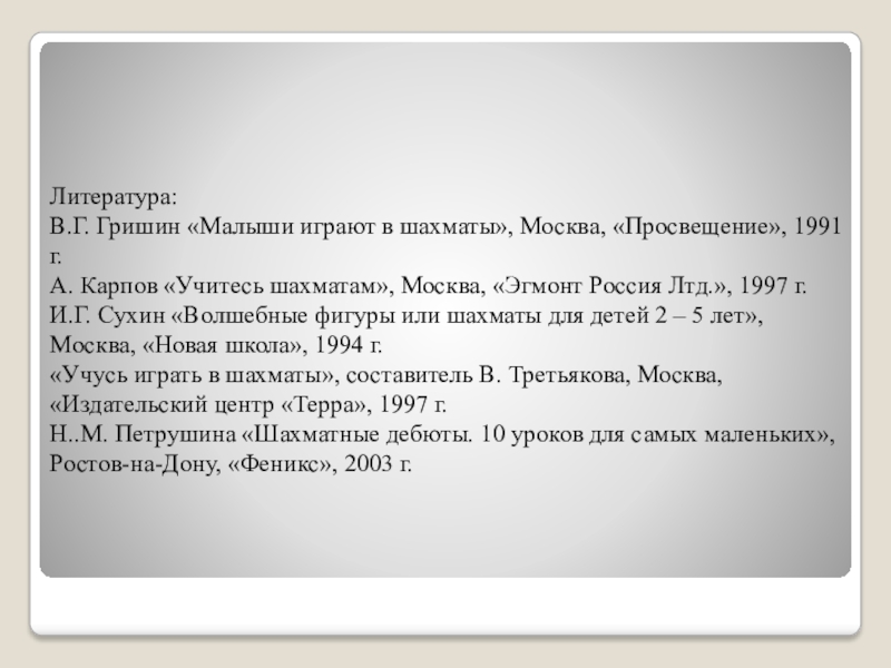 В.Г. Гришин «Малыши играют в шахматы», Москва, «Просвещение», 1991 г.