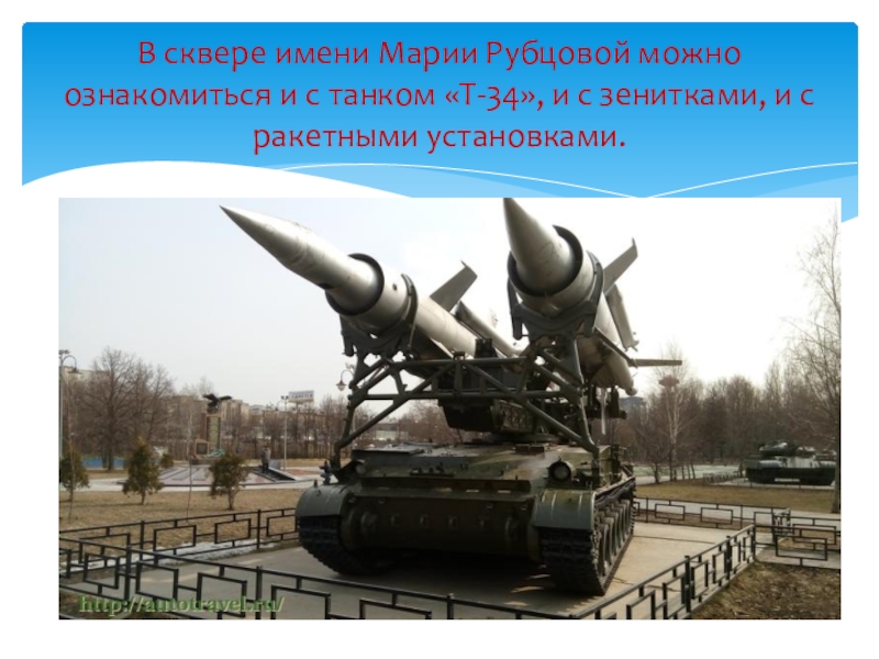Слайд 11В сквере имени Марии Рубцовой можно ознакомиться и с танком «Т-34»,