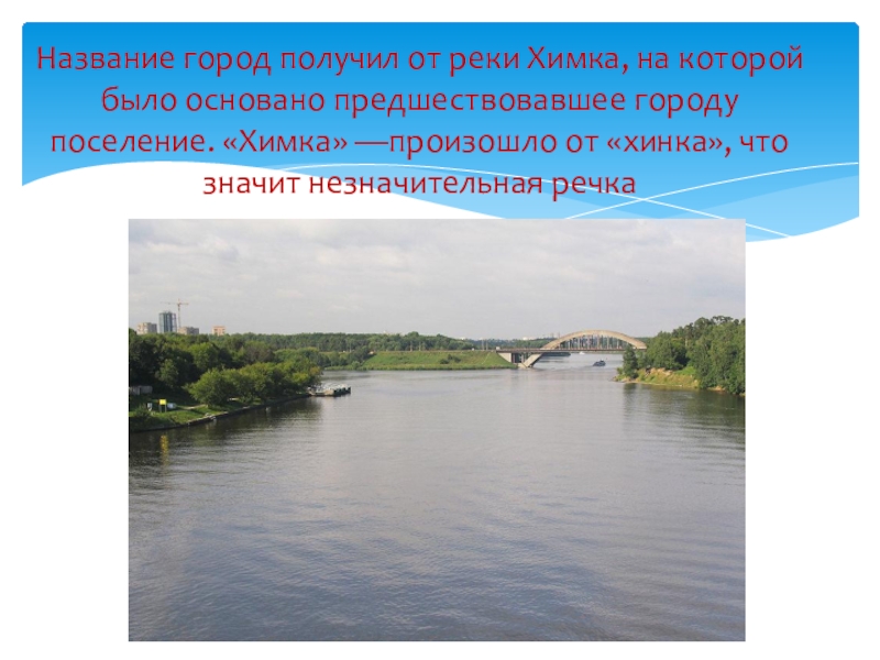Слайд 2Название город получил от реки Химка, на которой было основано предшествовавшее