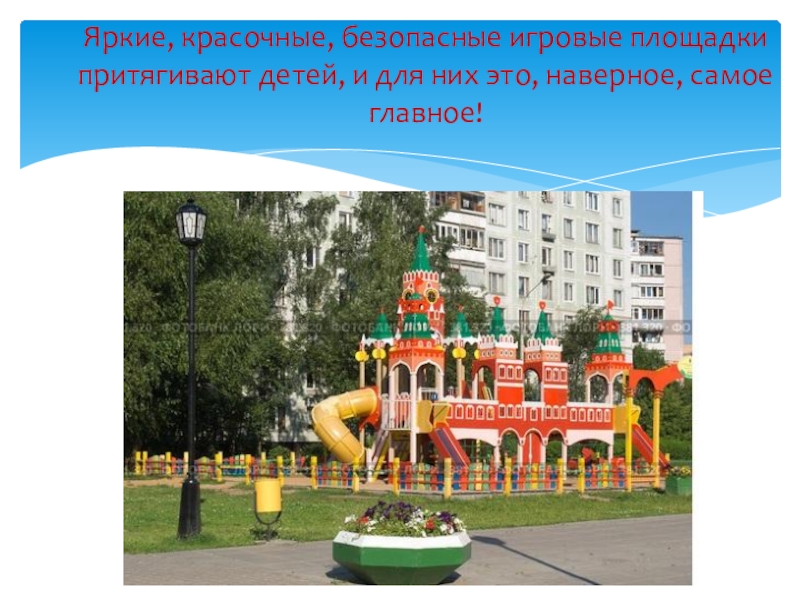 Слайд 7Яркие, красочные, безопасные игровые площадки притягивают детей, и для них это,