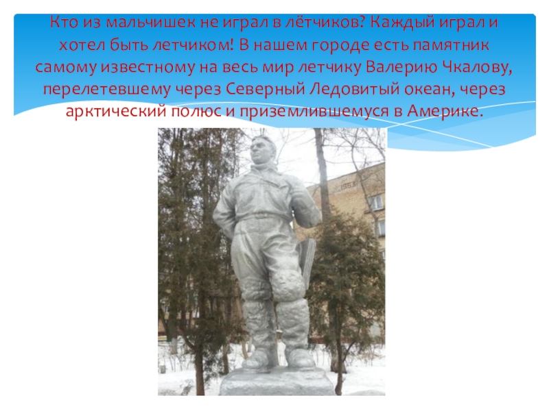 быть летчиком! В нашем городе есть памятник самому известному на весь мир летчику Валерию Чкалову, перелетевшему через Северный Ледовитый океан, через арктический полюс и приземлившемуся в Америке.