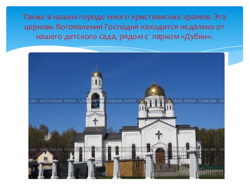 Слайд 14Также в нашем городе много христианских храмов. Эта церковь Богоявления Господня