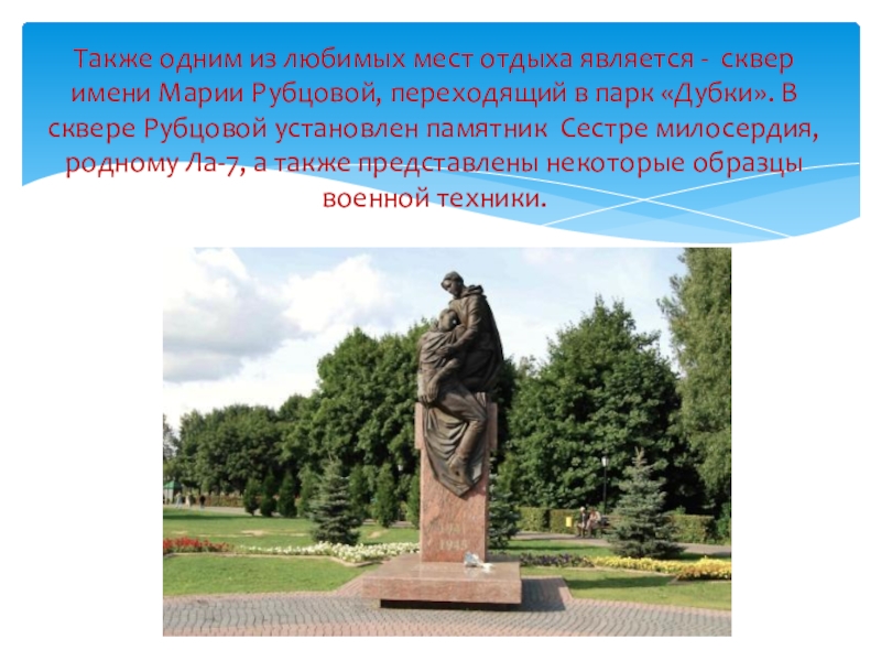 Рубцовой, переходящий в парк «Дубки». В сквере Рубцовой установлен памятник Сестре милосердия, родному Ла-7, а также представлены некоторые образцы военной техники.