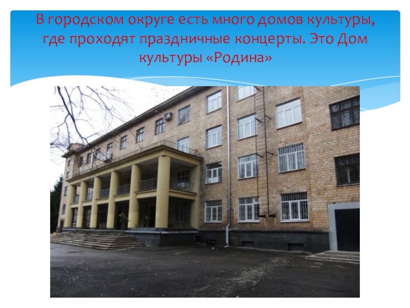 Слайд 15В городском округе есть много домов культуры, где проходят праздничные концерты.