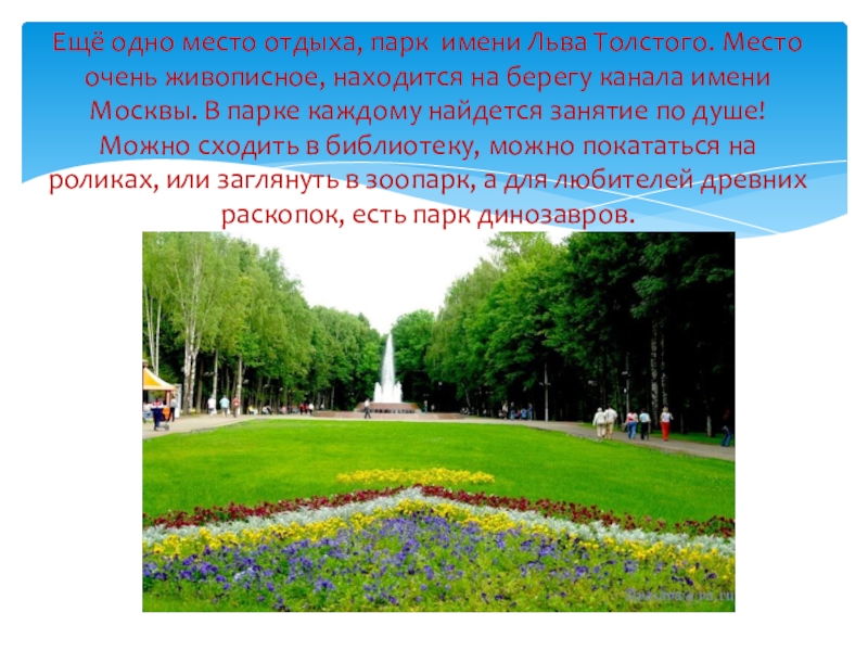 Слайд 8Ещё одно место отдыха, парк имени Льва Толстого. Место очень живописное,