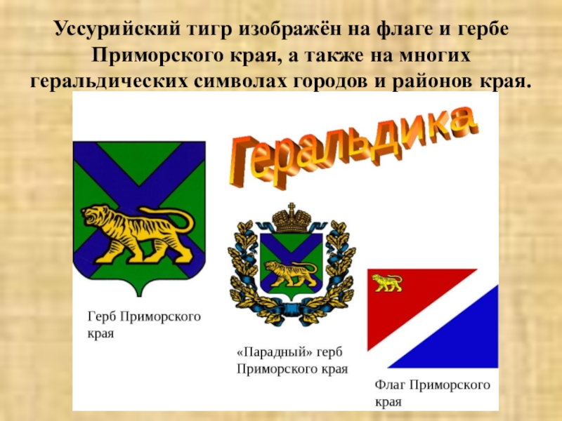 Слайд 23Уссурийский тигр изображён на флаге и гербе Приморского края, а также