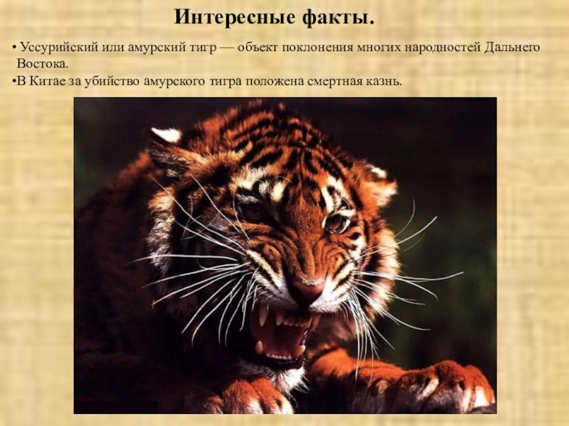 Интересные факты. Уссурийский или амурский тигр — объект поклонения многих народностей Дальнего Востока. В Китае за убийство