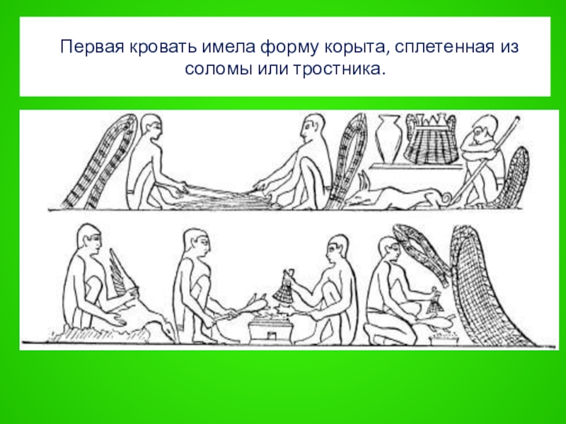 Слайд 18 Первая кровать имела форму корыта, сплетенная из соломы или тростника.