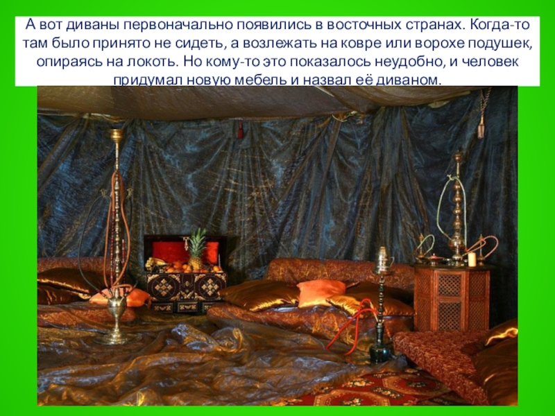 Слайд 38А вот диваны первоначально появились в восточных странах. Когда-то там было
