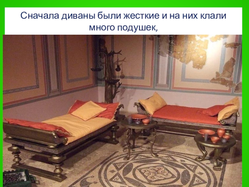 Слайд 39Сначала диваны были жесткие и на них клали много подушек,
