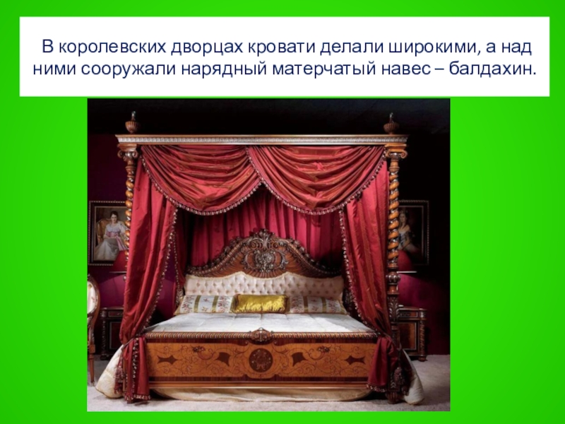 Слайд 21 В королевских дворцах кровати делали широкими, а над ними сооружали
