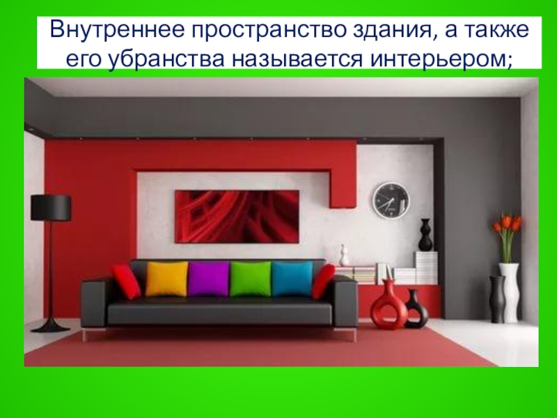 Слайд 54Внутреннее пространство здания, а также его убранства называется интерьером;