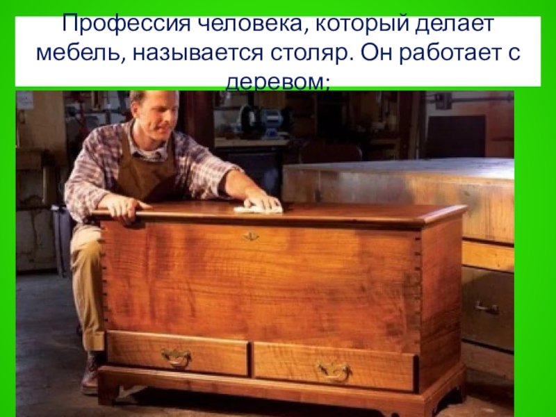 Слайд 52Профессия человека, который делает мебель, называется столяр. Он работает с деревом;