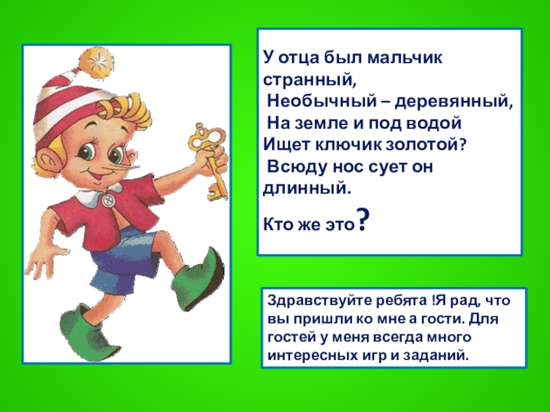 Здравствуйте ребята !Я рад, что вы пришли ко мне а гости. Для гостей у меня всегда много интересных игр и заданий.