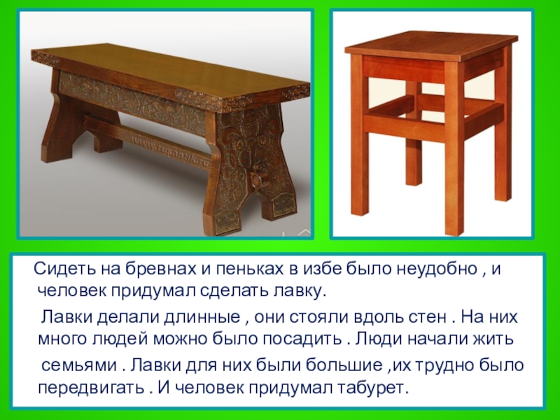 Лавки делали длинные , они стояли вдоль стен . На них много людей можно было посадить . Люди начали жить