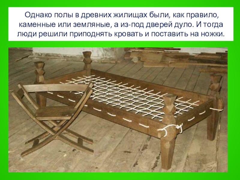 земляные, а из-под дверей дуло. И тогда люди решили приподнять кровать и поставить на ножки.
