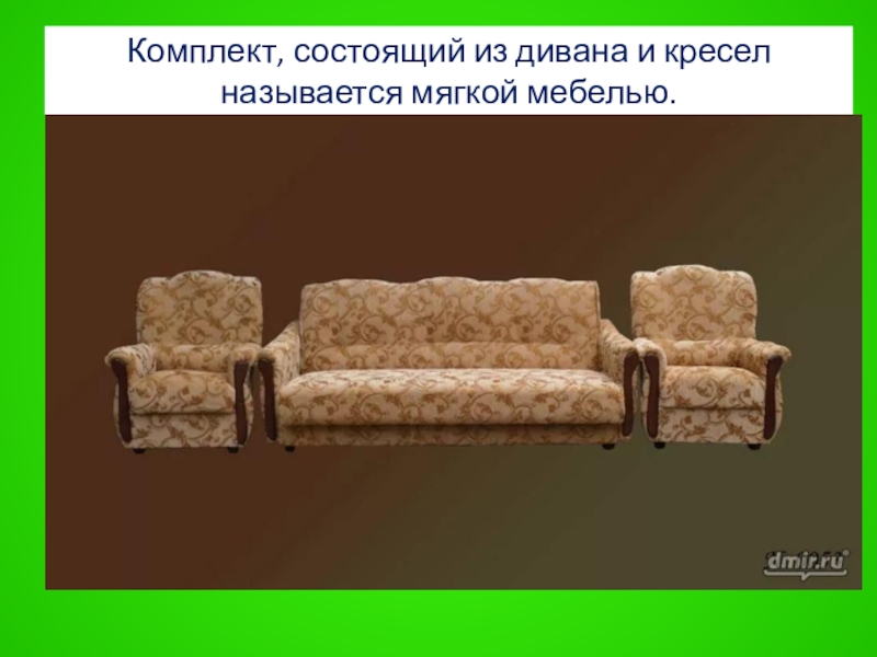 Слайд 55Комплект, состоящий из дивана и кресел называется мягкой мебелью.