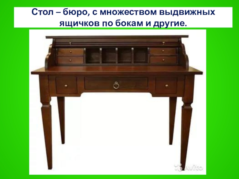 Слайд 35Стол – бюро, с множеством выдвижных ящичков по бокам и другие.
