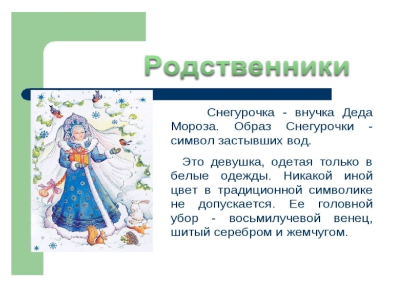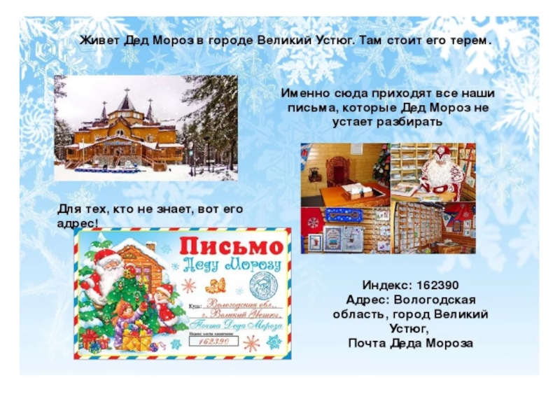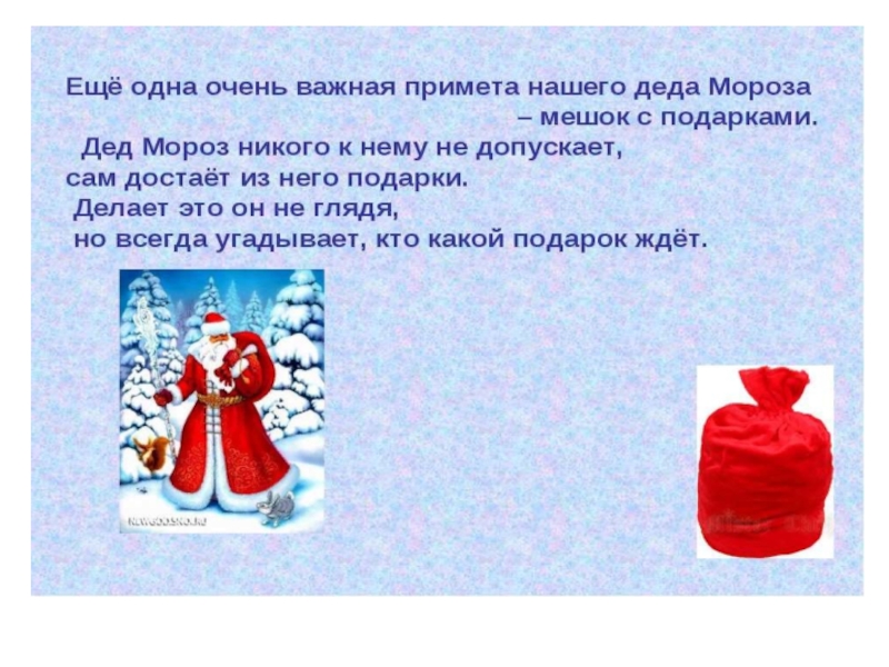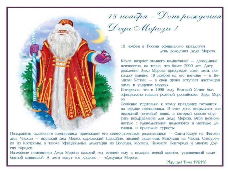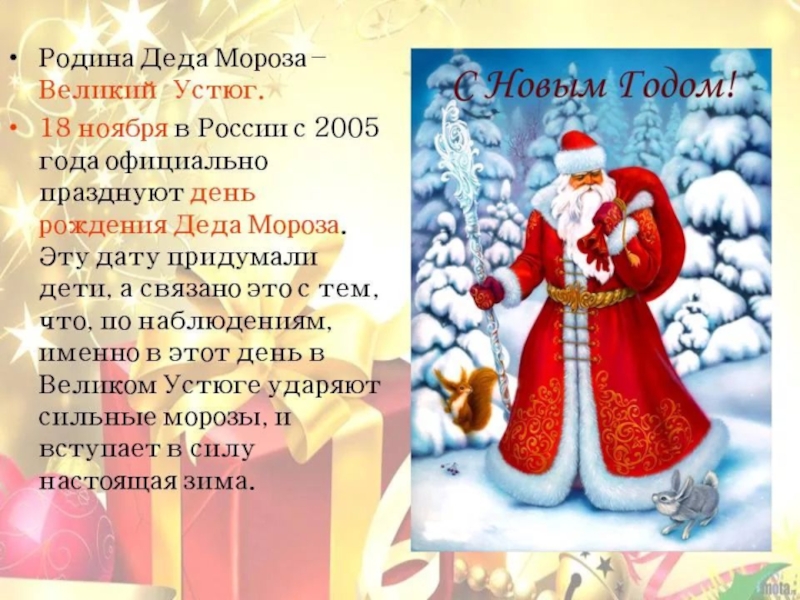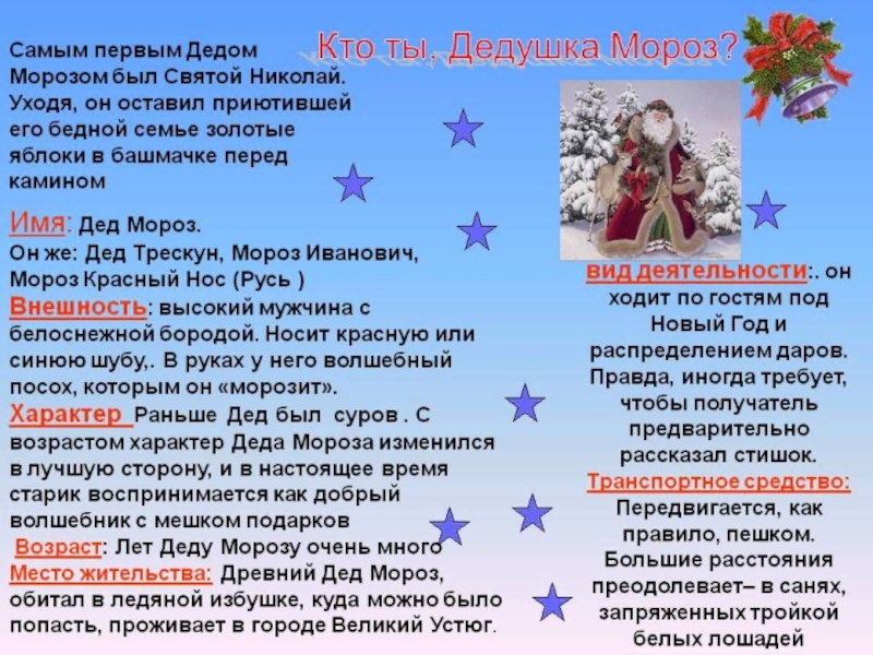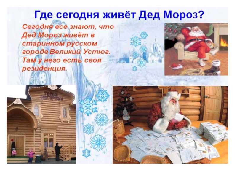 старичок. В его хоромах полно удивительных вещей: огромный трон, теплый камин, кровать с отдельными подушками на каждый день и даже комната желаний. С наступлением холодов, когда снег ложится уверенным покровом на землю, начинает дедушка обход владений. То речку заморозит, то дерево оденет в иней, а то вьюгу на дома людей пошлет. В новогоднюю же ночь он является с огромным мешком подарков за плечом. Достает оттуда разноцветные большие и маленькие сюрпризы и дарит детям счастье, радость и чудо. Самое настоящее волшебство. Кто же показывает его малышам? Без кого невозможно в наше время представить Новый год? И кто этот загадочный старичок с белой бородой? Конечно же, Дед Мороз! История его возникновения очень занимательная, а современная жизнь еще интересней.