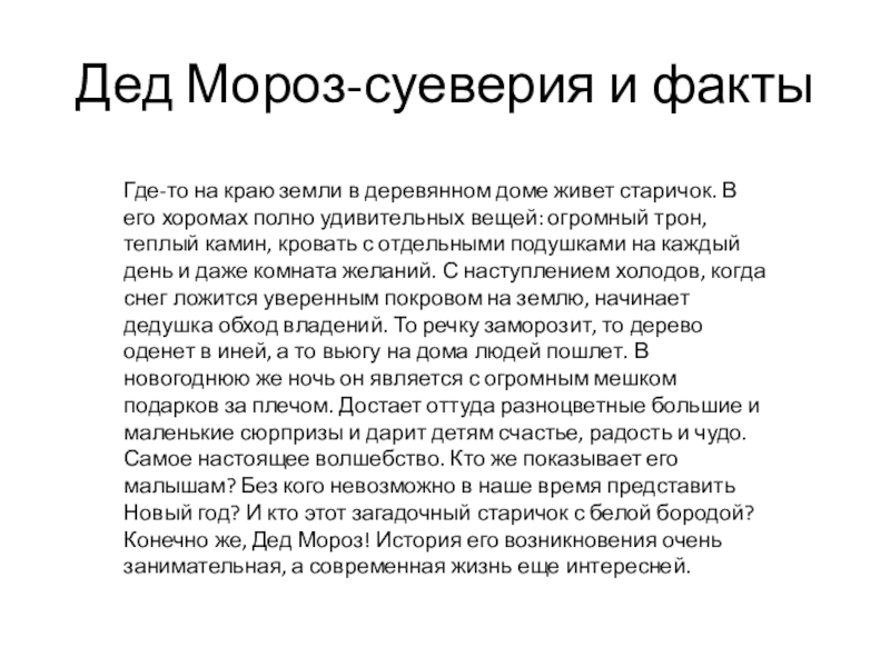 Дед Мороз-суеверия и фактыГде-то на краю земли в деревянном доме живет старичок. В его хоромах полно удивительных