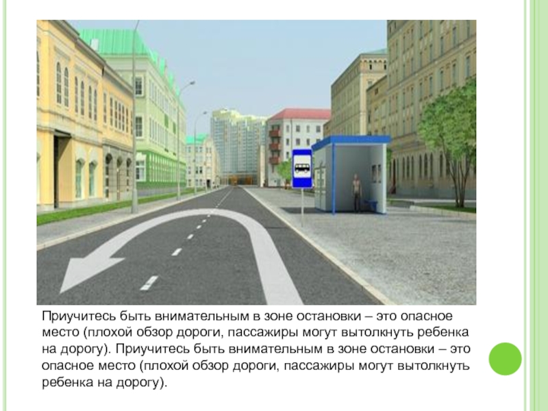 обзор дороги, пассажиры могут вытолкнуть ребенка на дорогу). Приучитесь быть внимательным в зоне остановки – это опасное место (плохой обзор дороги, пассажиры могут вытолкнуть ребенка на дорогу).