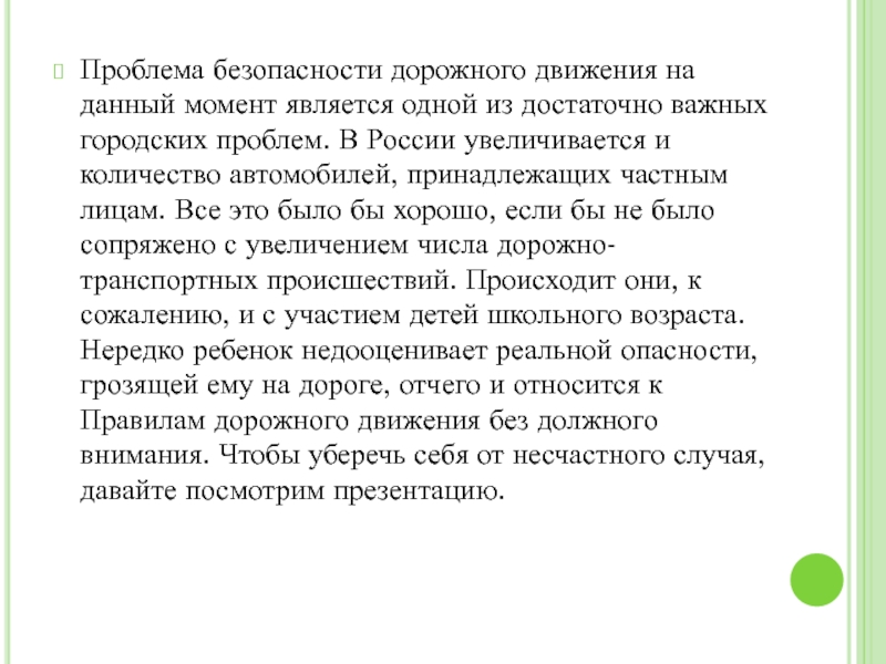 важных городских проблем. В России увеличивается и количество автомобилей, принадлежащих частным лицам. Все это было бы хорошо, если бы не было сопряжено с увеличением числа дорожно-транспортных происшествий. Происходит они, к сожалению, и с участием детей школьного возраста. Нередко ребенок недооценивает реальной опасности, грозящей ему на дороге, отчего и относится к Правилам дорожного движения без должного внимания. Чтобы уберечь себя от несчастного случая, давайте посмотрим презентацию.