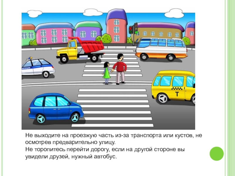 Слайд 10Не выходите на проезжую часть из-за транспорта или кустов, не осмотрев