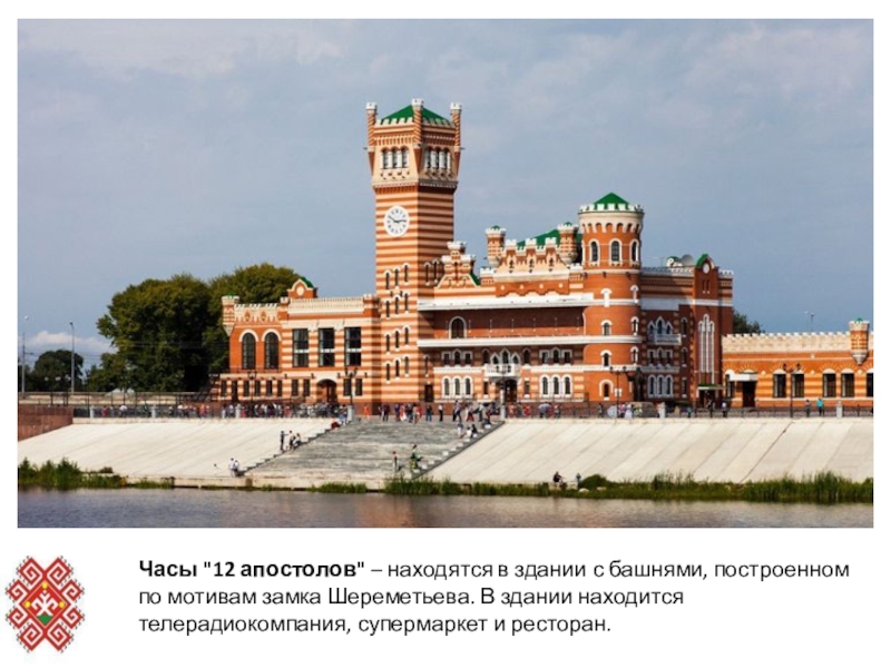 Слайд 5Часы "12 апостолов" – находятся в здании с башнями, построенном по мотивам
