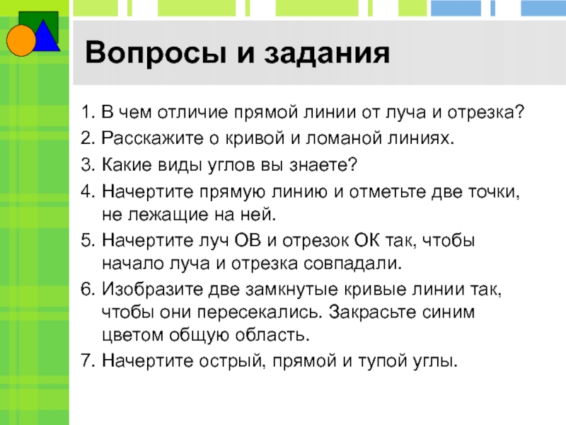 Вопросы и задания1. В чем отличие прямой линии от луча и отрезка?2. Расскажите о кривой и ломаной