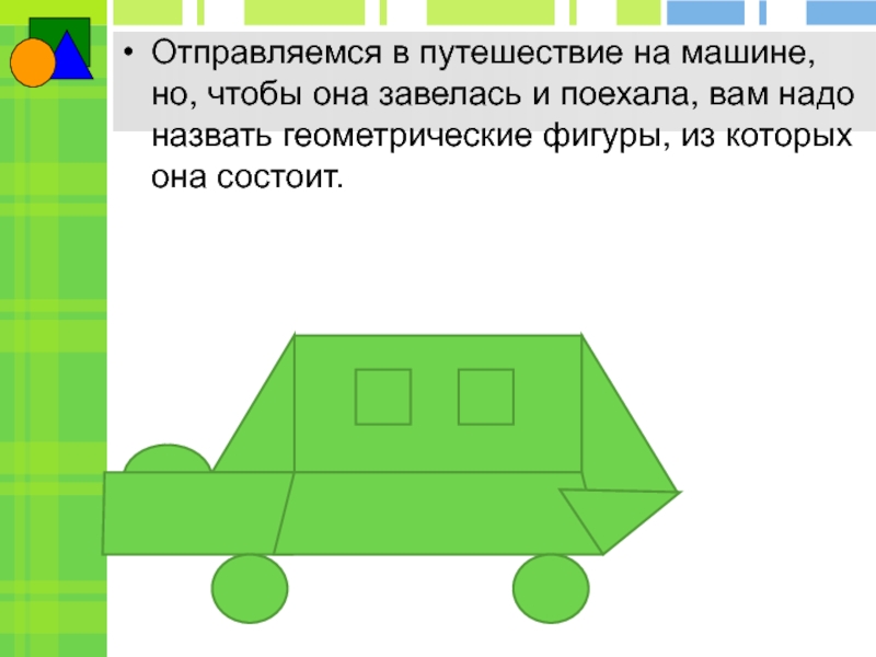 Отправляемся в путешествие на машине, но, чтобы она завелась и поехала, вам надо назвать геометрические фигуры, из которых она состоит.