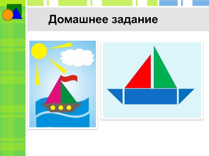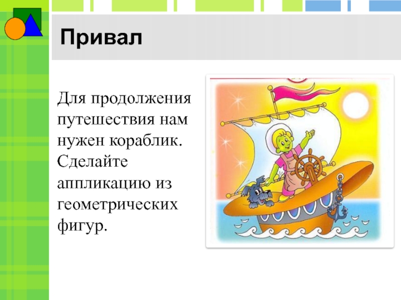 Привал Для продолжения путешествия нам нужен кораблик. Сделайте аппликацию из геометрических фигур.
