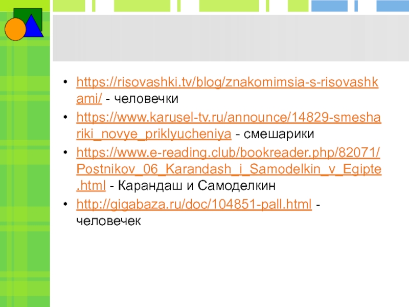 https://risovashki.tv/blog/znakomimsia-s-risovashkami/ - человечкиhttps://www.karusel-tv.ru/announce/14829-smeshariki_novye_priklyucheniya - смешарикиhttps://www.e-reading.club/bookreader.php/82071/Postnikov_06_Karandash_i_Samodelkin_v_Egipte.html - Карандаш и Самоделкинhttp://gigabaza.ru/doc/104851-pall.html - человечек