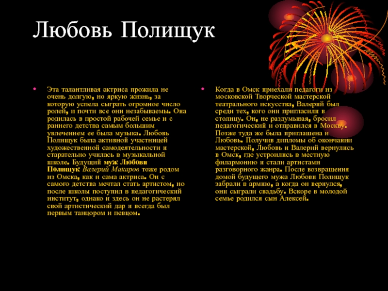 Когда в Омск приехали педагоги из московской Творческой мастерской театрального искусства, Валерий был среди тех, кого они пригласили в столицу. Он, не раздумывая, бросил педагогический и отправился в Москву. Позже туда же была приглашена и Любовь. Получив дипломы об окончании мастерской, Любовь и Валерий вернулись в Омск, где устроились в местную филармонию и стали артистами разговорного жанра. После возвращения домой будущего мужа Любови Полищук забрали в армию, а когда он вернулся, они сыграли свадьбу. Вскоре в молодой семье родился сын Алексей.