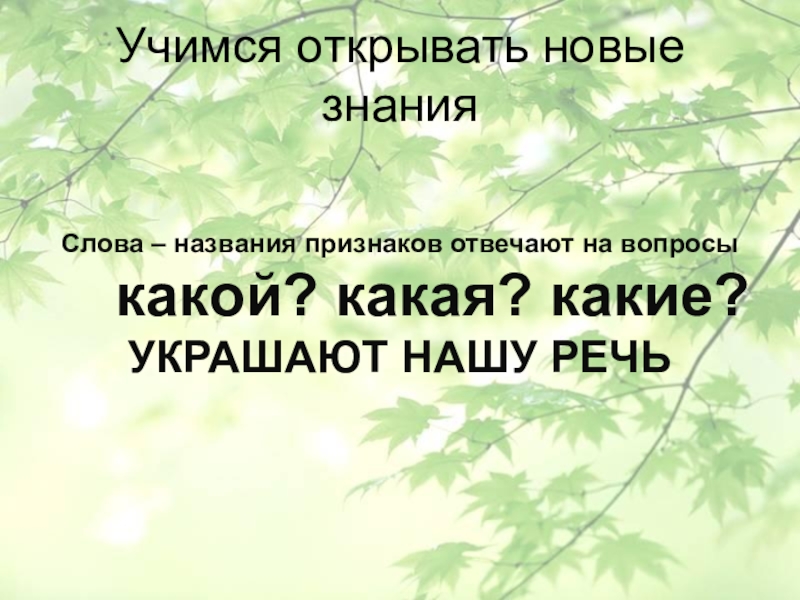 Учимся открывать новые знанияСлова – названия признаков отвечают на вопросы     какой? какая? какие?УКРАШАЮТ