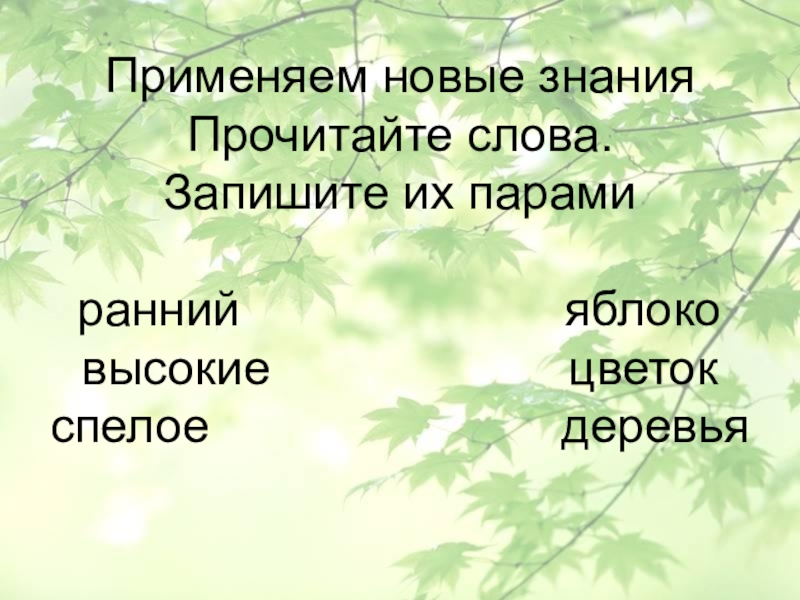 Слайд 12 Применяем новые знания Прочитайте слова. Запишите их парами ранний