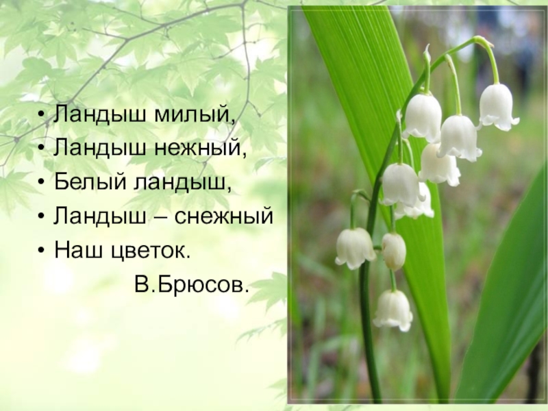 Ландыш милый,Ландыш нежный,Белый ландыш,Ландыш – снежныйНаш цветок.        В.Брюсов.