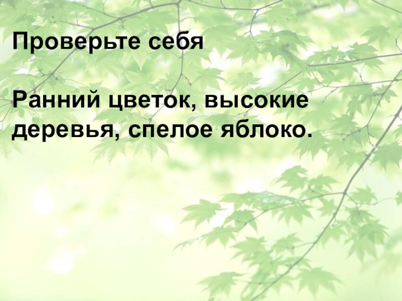 Проверьте себяРанний цветок, высокие деревья, спелое яблоко.